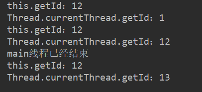 class MyThread extends Thread{ @Override public void run() { try { Thread.sleep(1000); System.out.println("this.getId:"+this.getId()); System.out.println("Thread.currentThread.getId:"+Thread.currentThread().getId()); } catch (InterruptedException e) { e.printStackTrace(); } } } public class Test{ public static void main(String[] args) throws InterruptedException { MyThread myThread=new MyThread(); myThread.run(); Thread.sleep(1000); myThread.start(); Thread.sleep(1000); Thread thread=new Thread(myThread); thread.start(); System.out.println("main线程已经结束"); } }