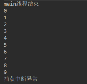 class ThreadA extends Thread{ @Override public void run() { try{ for(int i=0;i<10;i++){ System.out.println(i); } Thread.sleep(1000); System.out.println("线程还未中断"); }catch (Exception e){ System.out.println("捕获中断异常"); } } } public class Test{ public static void main(String[] args){ ThreadA threadA = new ThreadA(); threadA.start(); threadA.interrupt(); System.out.println("main线程结束"); } }