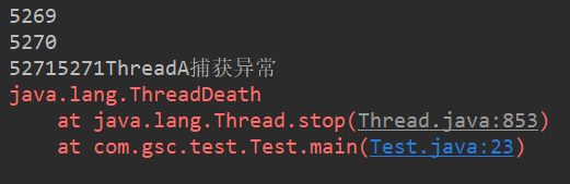 class ThreadA extends Thread{ @Override public void run() { try{ for(int i=0;i<50000;i++){ System.out.println(i); } System.out.println("线程还在执行"); }catch (ThreadDeath e){ System.out.println("ThreadA捕获异常"); e.printStackTrace(); } } } public class Test{ public static void main(String[] args){ ThreadA threadA = new ThreadA(); threadA.start(); try{ Thread.sleep(100); threadA.stop(); }catch (ThreadDeath e){ System.out.println("main捕获异常"); e.printStackTrace(); }catch (Exception e){ } } }