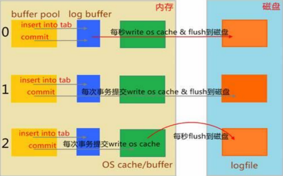 1默认情况下,日志缓冲区将写入日志文件,并在每次事务后执行刷新到磁盘。这是完全遵守ACID特性
