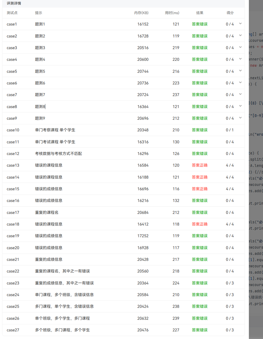 import java.util.*; public class Main { public static void main(String[] args) { LinkedHashSet<Course> Allcourses = new LinkedHashSet<>(); ArrayList<Class> Allclasses = new ArrayList<>(); Judge judge = new Judge(); Scanner scanner = new Scanner(System.in); ArrayList<String> Date = new ArrayList<>(); while (true) { String New = scanner.nextLine(); if (New.equals("end")) { break; } if(New.matches("[0-9]{8} [\\S]{1,11} [\\S]{1,11}\\S(0|100|[1-9][0-9]?) (0|100|[1-9][0-9]?)")){ Date.add(New); }else if(New.matches("[0-9]{8} [\\S]{1,10} [\\S]{1,10} (0|100|[1-9][0-9]?)")){ Date.add(New); }else{ System.out.println("wrong format"); } } for (String message : Date) { String[] A = message.split(" "); if (A.length == 3 || A.length == 2) { if (A.length == 2) {//长度为2必然必修或者错误选修 if (A[1].equals("必修")) { Course newcourse = new Course(A[0], A[1], true); Allcourses.add(newcourse); } else { System.out.println("wrong format"); } } else { if (A[1].equals("必修")&&A[2].equals("考察")){ System.out.println(A[0]+" : course type & access mode mismatch"); }else{ if (A[1].equals("必修")) {//有考试形式的必修课 Course newcourse = new Course(A[0], A[1], true); Allcourses.add(newcourse); } else if (A[1].equals("选修") && A[2].equals("考试")) {//有考试形式的选修 Course newcourse = new Course(A[0], A[1], true); Allcourses.add(newcourse); } else if (A[1].equals("选修") && A[2].equals("考察")) { Course newcourse = new Course(A[0], A[1], false); Allcourses.add(newcourse); } else {//输入错误统一输出 System.out.println("wrong format"); } } } } else if (A.length == 4 || A.length == 5) {//长度为4,5时录入学生信息 if (judge.LegalCourse(A[2], A.length, Allcourses) == 1) { if (A.length == 4) { Student student = new Student(A[0], A[1]); Score score = new Score(A[2], Integer.parseInt(A[3])); for(Course course:Allcourses){ if(course.getName().equals(A[2])){ course.addScore(score); } } student.getScores().add(score); if (judge.isClassExist(student.getId().substring(0, 6), Allclasses)) { judge.SearchClass(student.getId().substring(0, 6), Allclasses).addStudent(student); } else { Class newclass = new Class(student.getId().substring(0, 6)); newclass.addStudent(student); Allclasses.add(newclass); } }else{ Student student = new Student(A[0], A[1]); Score score = new Score(A[2], Integer.parseInt(A[3]),Integer.parseInt(A[4])); for(Course course:Allcourses){ if(course.getName().equals(A[2])){ course.addScore(score); } } student.getScores().add(score); if (judge.isClassExist(student.getId().substring(0, 6), Allclasses)) { judge.SearchClass(student.getId().substring(0, 6), Allclasses).addStudent(student); } else { Class newclass = new Class(student.getId().substring(0, 6)); newclass.addStudent(student); Allclasses.add(newclass); } } }else if(judge.LegalCourse(A[2], A.length, Allcourses) == -1){ System.out.println(A[0]+" "+A[1]+" "+": access mode mismatch"); }else{ System.out.println(A[0]+" "+A[1]+" "+":"+A[2]+"does not exist"); } } } for (Class classA:Allclasses){//个人总成绩平均分 Collections.sort(classA.getStudents()); for(Student student:classA.getStudents()){ student.getTotal(); } } for(Course course:Allcourses){ if(course.getIsNomal()){ course.NormalAverage(); }else { course.ExamAverage(); } } Collections.sort(Allclasses); for(Class classA:Allclasses){ classA.getaverege(); } } } class Course { private String Name; private String isRequired;//课程类型 private Boolean isNomal;//是否有平时成绩 private ArrayList<Score> scores = new ArrayList<>();//单科成绩数组 Course(){ } Course(String name,String form,Boolean Normal){ this.isRequired = form; this.Name = name; this.isNomal = Normal; } public String getName() { return Name; } public String getForm() { return isRequired; } public void setForm(String form) { this.isRequired = form; } public void setName(String name) { Name = name; } public Boolean getIsNomal() { return isNomal; } public void setIsNomal(Boolean exam) { isNomal = exam; } public void addScore(Score score){ scores.add(score); } public void NormalAverage(){ if(scores.size() !=0){ int sum =0; int exam = 0; int total = 0; for (Score score:scores){ sum += score.getQuiz(); exam += score.getExam(); total += score.getScore(); } System.out.println(Name +" "+sum/scores.size()+" "+exam/scores.size()+" "+total/scores.size()); } else { System.out.println(Name+" "+"has no grades yet"); } } public void ExamAverage(){ if(scores.size() !=0){ int exam = 0; int total = 0; for (Score score:scores){ exam += score.getExam(); total += score.getScore(); } System.out.println(Name +" "+exam/scores.size()+" "+total/scores.size()); } else { System.out.print(Name+" "+"has no grades yet"); } } } class Judge {//判断类,检测是否合法 public boolean isClassExist(String classNumber, ArrayList<Class> Allclasses){ for(Class classA:Allclasses){ if(classA.getClassid().equals(classNumber)){ return true; } } return false; } public Class SearchClass(String Id,ArrayList<Class> Allclasses){ Class Temporaray = null; for(Class classA:Allclasses){ if(classA.getClassid().equals(Id)){ Temporaray = classA; } } return Temporaray; } public int LegalCourse(String name, int A, HashSet<Course> Allcourses){ for(Course course:Allcourses){ if(course.getName().equals(name)){ if ((!(course.getIsNomal()) && A == 5) || (course.getIsNomal() && A ==4)){ return -1; }else { return 1; } } } return 0; } } class Class implements Comparable<Class>{ private String ClassId;//班级 private ArrayList <Student> students = new ArrayList<>(); Class(){ } Class(String Id){ this.ClassId = Id; } public ArrayList<Student> getStudents() { return students; } public void setStudents(ArrayList<Student> students) { this.students = students; } public void addStudent(Student student){ students.add(student); } public String getClassid() { return ClassId; } public void setClassid(String classid) { this.ClassId = classid; } public void getaverege(){ int sum = 0; for(Student A:students){ sum += A.getaverage(); } if(s