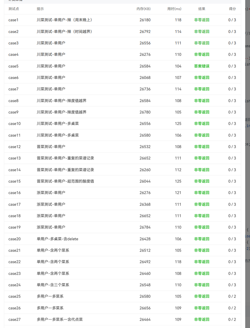 题目分析:这道题难度很大,在满足普通客户点菜的前提下,还需要考虑特色菜、菜品菜系、数据是否合法以及下单时间是否在营业时间区间内等等。单个数据的判断并不难,但如此多的限制条件相结合的情况下就让这道题的难度直线上升,经过努力之后最后按照提示艰难写出了示例代码,但是提交上去的结果却是非零返回,明明在编译器中能顺利运行,但是在pta内提交却出现我意料之外的结果,在后续我也检查过是否是方法体错误导致的,但在检查后我个人认为并没有什么问题,所以这次代码的结果就是提交结果为非零返回。又因为这次代码的错误编程,迭代代码也根本没有参照蓝本,所以后续的迭代代码的编写也以失败告终。