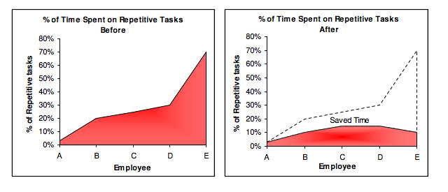 根据Tethys Solution的一项研究,一支5人团队,如果把3%、20%、25%、30%和70%时间花在重复性工作上,经过2个月的生产力强化(引入自动化软件)后,时间相应降至3%、10%、15%、15%和10%。