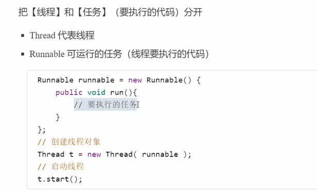 4. 再去创建一个 Thread 类的对象,然后把 实现 Runnable 接口的那个类的对象 作为一个参数 传递进来