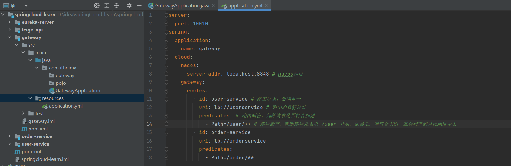 这些配置是让网关能够联系上 Nacos,实现网关服务的注册,以及服务发现