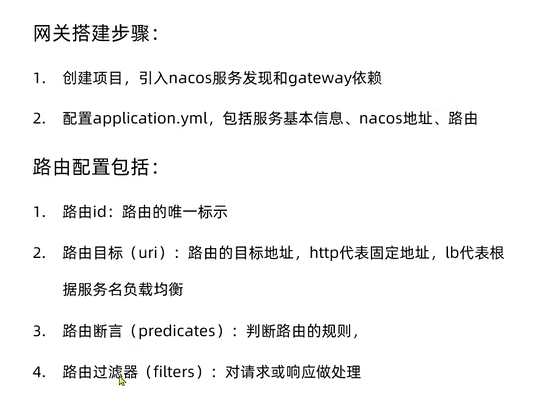 假设用户发起了一个请求:http://localhost:10010/user/1,因为网关的端口是 10010,所以请求一定会进入网关,而网关是无法处理业务的,所以网关只能基于路由规则进行判断,而 /user/1 符合 - Path=/user/** 的规则,所以网关把用户的请求代理到 userservice(uri: lb://userservice ),接下来网关会拿着 userservice 去 Nacos 注册中心里找对应的地址,再做负载均衡挑一个,假设挑到了 localhost:8082,请求就会发到 localhost:8082 去了。如果某个请求,所有的路由规则它都不符合,就认为这个请求无法路由,就会有一个404