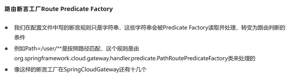 我们在配置文件中写的断言规则只是字符串,这些字符串会被 Predicate Factory 读取并处理,转变为路由判断的条件