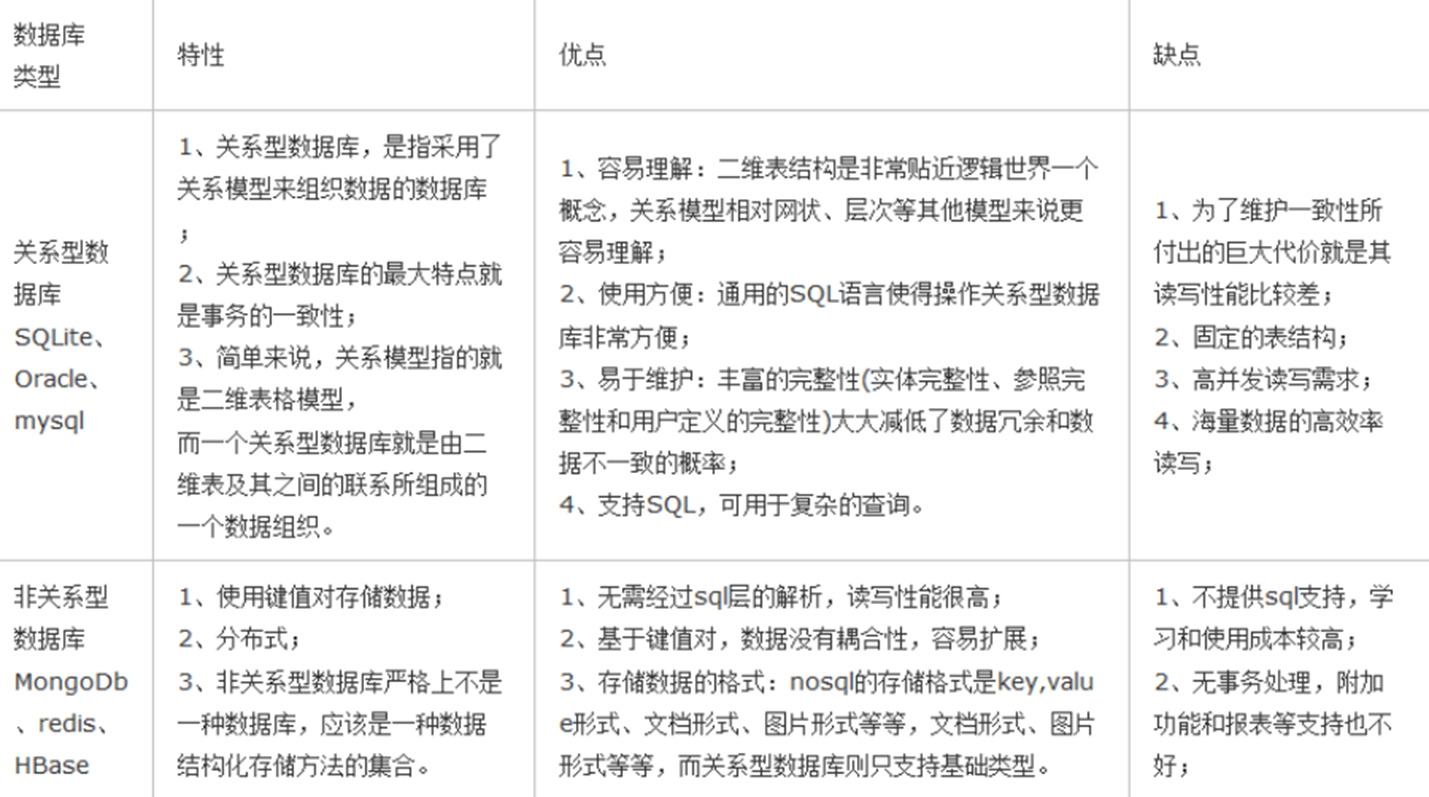 是存储键值对的,每个表之间不存在关联,都是独立的。但是它既有关系型数据库处理数据的方便性,还能处理大量数据,比较火的就是Redis、mongoDB。