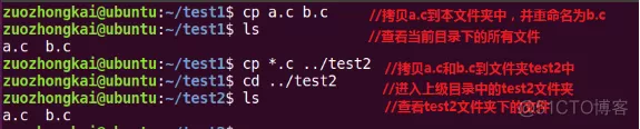 我们添加了一些高级使用技巧,首先是拷贝a.c和b.c文件到test2文件夹中,我们使用了通配符“*”,