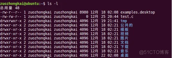 后面的“zuozhongkai zuozhongkai”分别代表文件拥有者(用户)和该用户所在的用户组,因此文件test.c的权限情况如下: