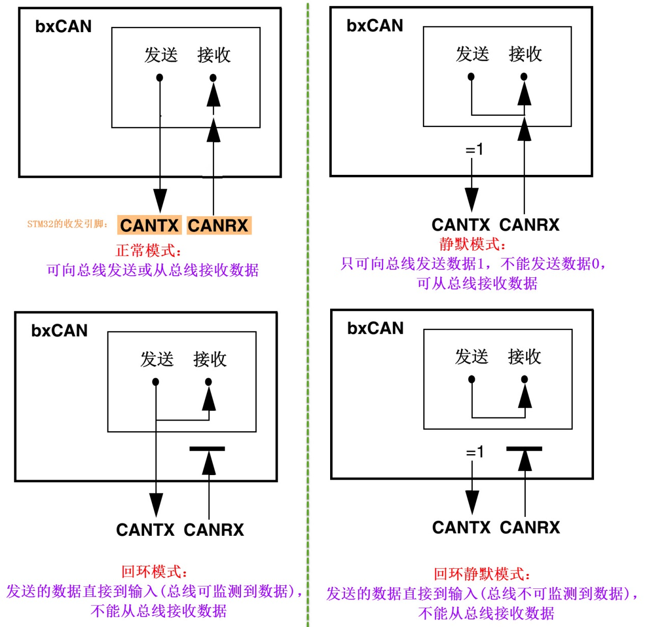 当我们使用CAN外设发送数据时,把报文的各个段分解,存入到发送邮箱的对应的寄存器中。