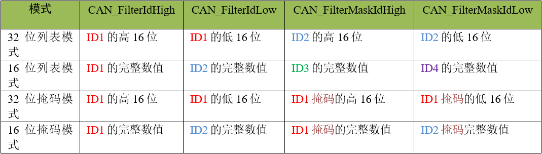FxR1高低16位,FxR2高低16位,存储FIFO编号,筛选器编号,筛选器模式(32or16,列表或掩码),激活筛选器