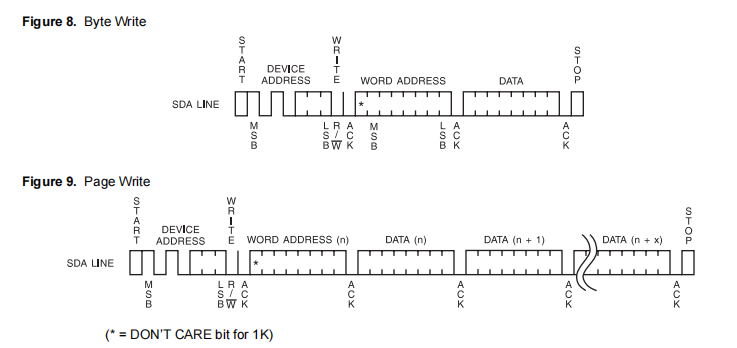 字节写:起始信号,从机地址,R/W,ACK,写入地址,数据,ACK,停止信号