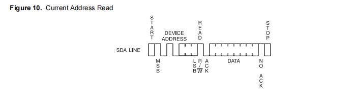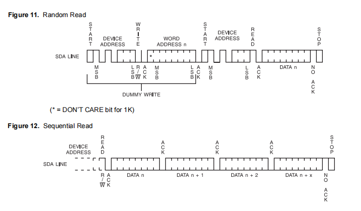 随机读:起始信号,从机地址,R,ACK,读取地址,起始信号,从机地址,R,ACK,数据,NO-ACK,停止信号