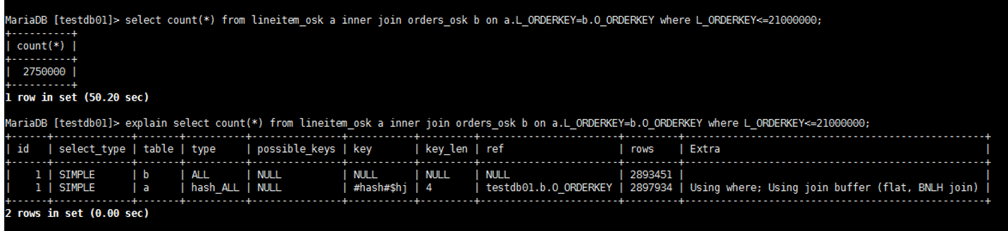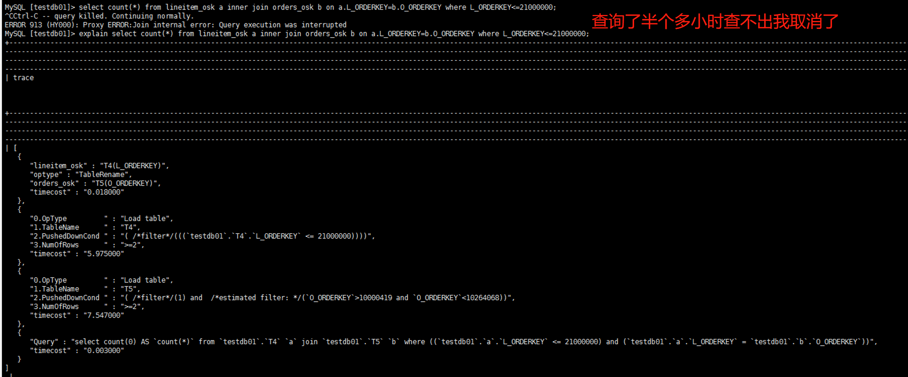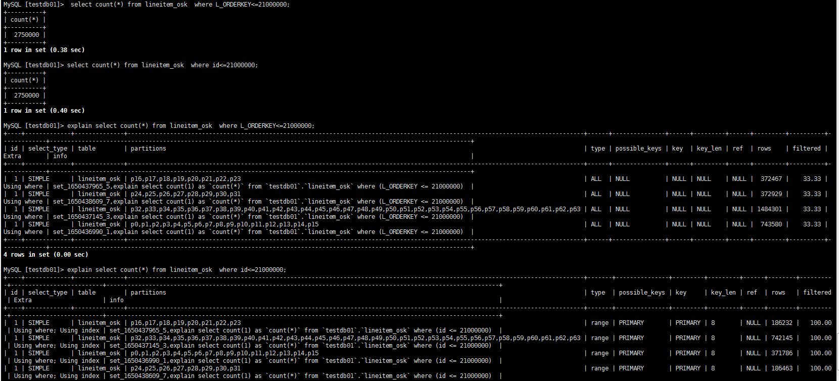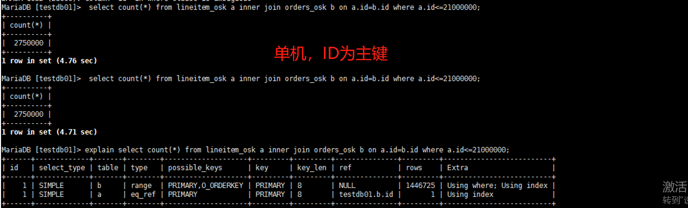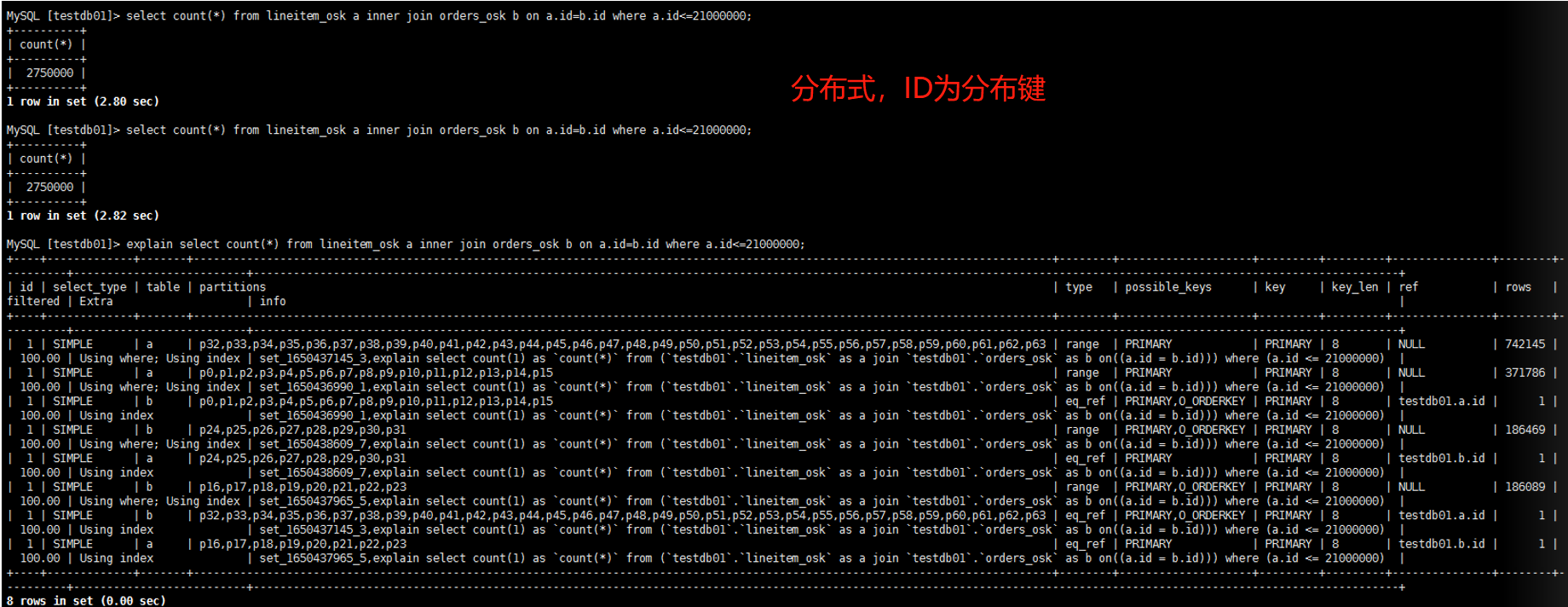2.1 测试的SQL语句如下,注意其中的ID与L_ORDERKEY、O_ORDERKEY值是一样的,只是为了区分测试是不是shardkey的区别;