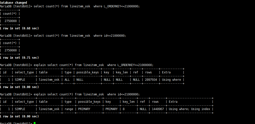 1.2非分布式集群里有两个表lineitem_osk和orders_osk数据量都是300万,两表建有一个ORDERKEY字段值一样,其中lineitem_osk表里的ID字段和L_ORDERKEY,orders_osk表里的ID字段和O_ORDERKEY的值是一样的,目的是为了区分主键关联,非主键关联的查询性能,建表语句如下: