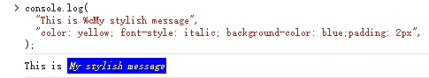 console.log( "This is %cMy stylish message", "color: yellow; font-style: italic; background-color: blue;padding: 2px", );
