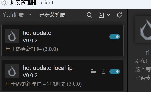 重启后在扩展管理器中看到这2个插件生效才行。这样在每次构建结束后,插件才会给main.js附加上搜索路径设置的逻辑。