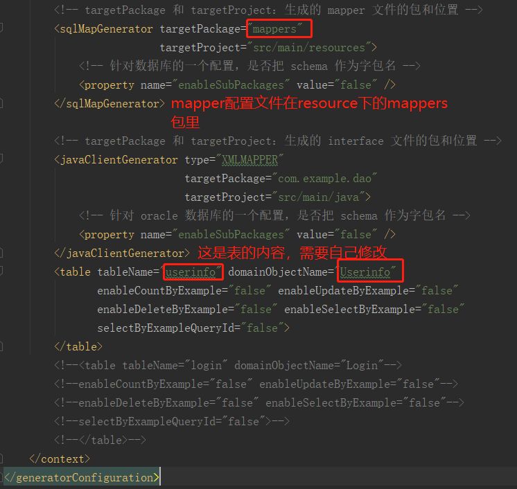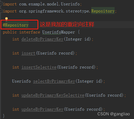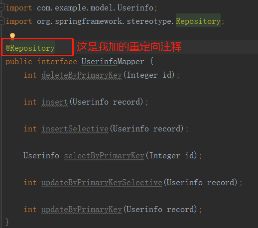 然后,就可以一项项的修改java下的文件了,首先修改dao里的UserinfoMapper,这个是对表的操作接口。