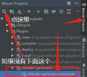 然后,就可以点击右边的Maven Project窗口,双击mybatis-generator就行了,如果没有看见mybatis-generator,点击窗口里左上的刷新按键就会出现了。