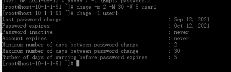 -m days: 指定用户必须改变口令所间隔的最少天数。如果值为0,口令就不会过期。