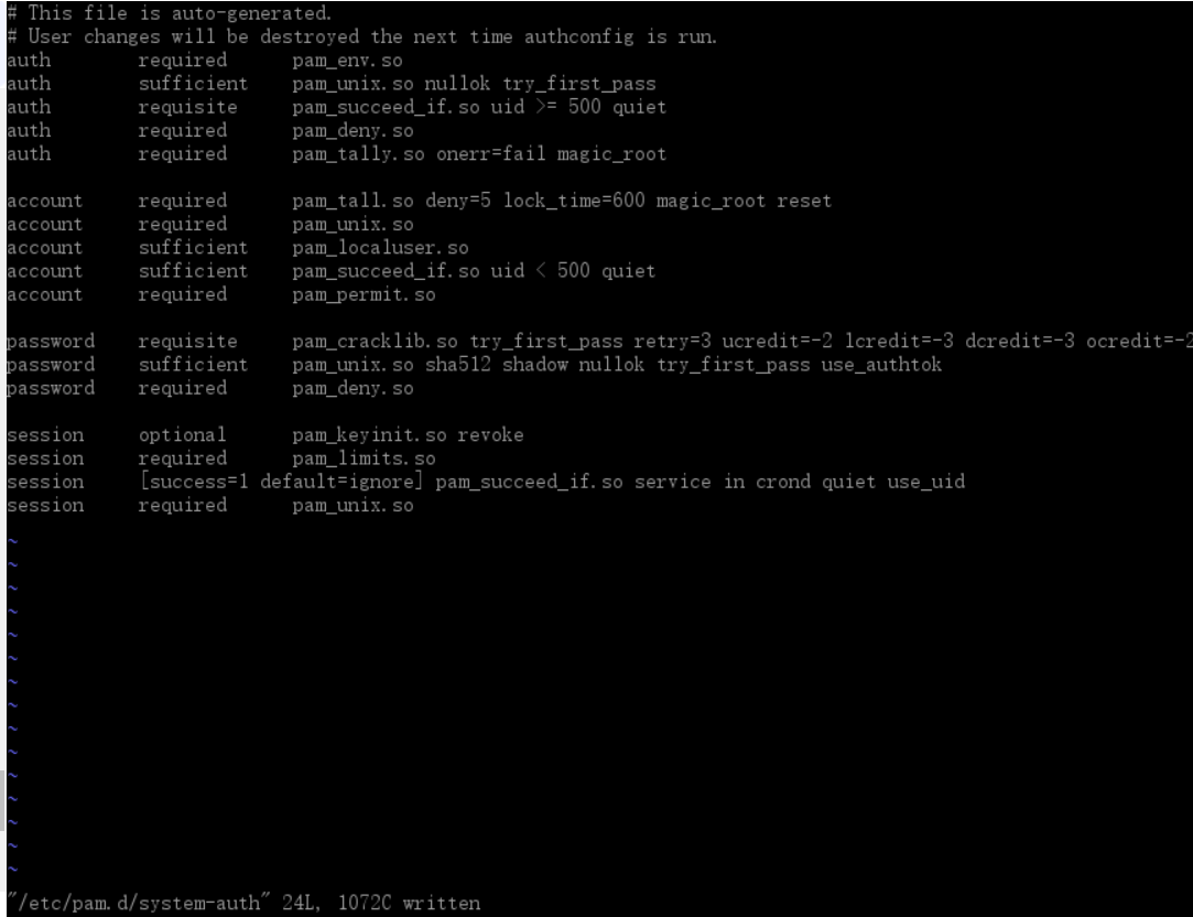 修改/etc/pam.d/system-auth配置:(注意:在root用户下进行,其余用户对这个文件只有读的权限)