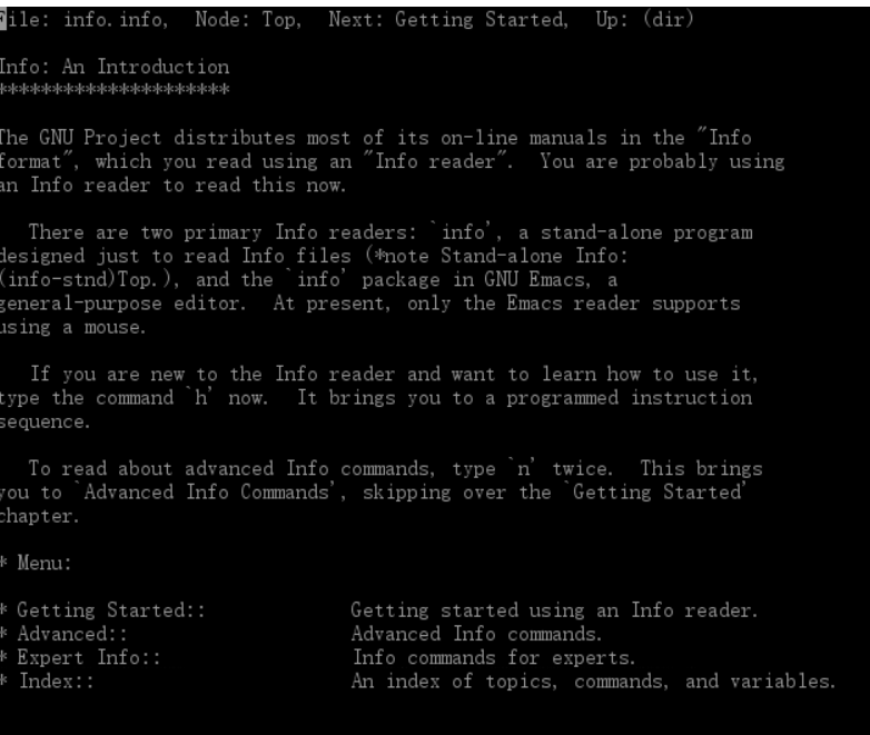 Node:代表目前的这个页面是属于Top节点。 意思是info.info内含有很多信息,而Top仅是info.info文件内的一个节点内容而已;
