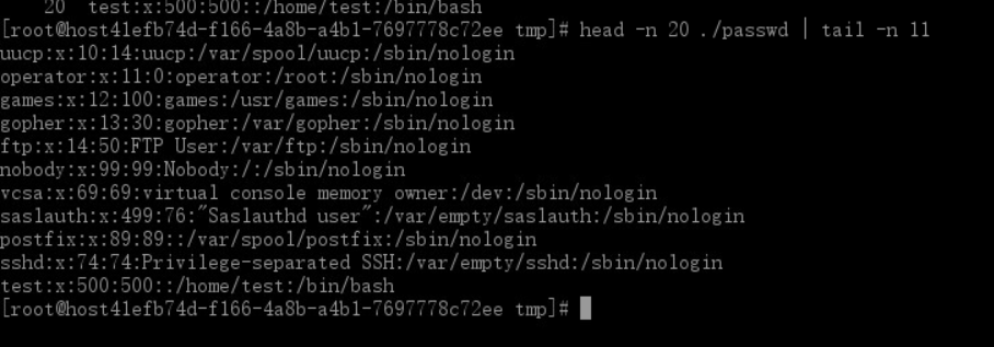 想一想,如果我要选取/tmp/passwd 文件的第10到20行的内容该怎么办呢?我们可以这样做,先选取头20行,然后再取后11行不就行了。那怎么做呢。这里我们就要用到管道命令了。先用 head 选取前20行,然后把输出结果交给tail命令选取后11行内容就行了。
