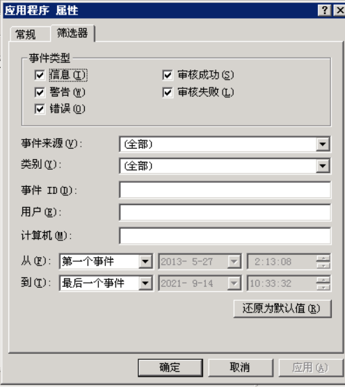 选中事件查看器中左边的树形结构图中的日志类型(应用程序、安全性或系统),右击“查看”,并选择“筛选”。或者点击属性页面的筛选器标签,日志筛选器将会启动。通过筛选器系统会过滤出管理员希望查看的日志记录