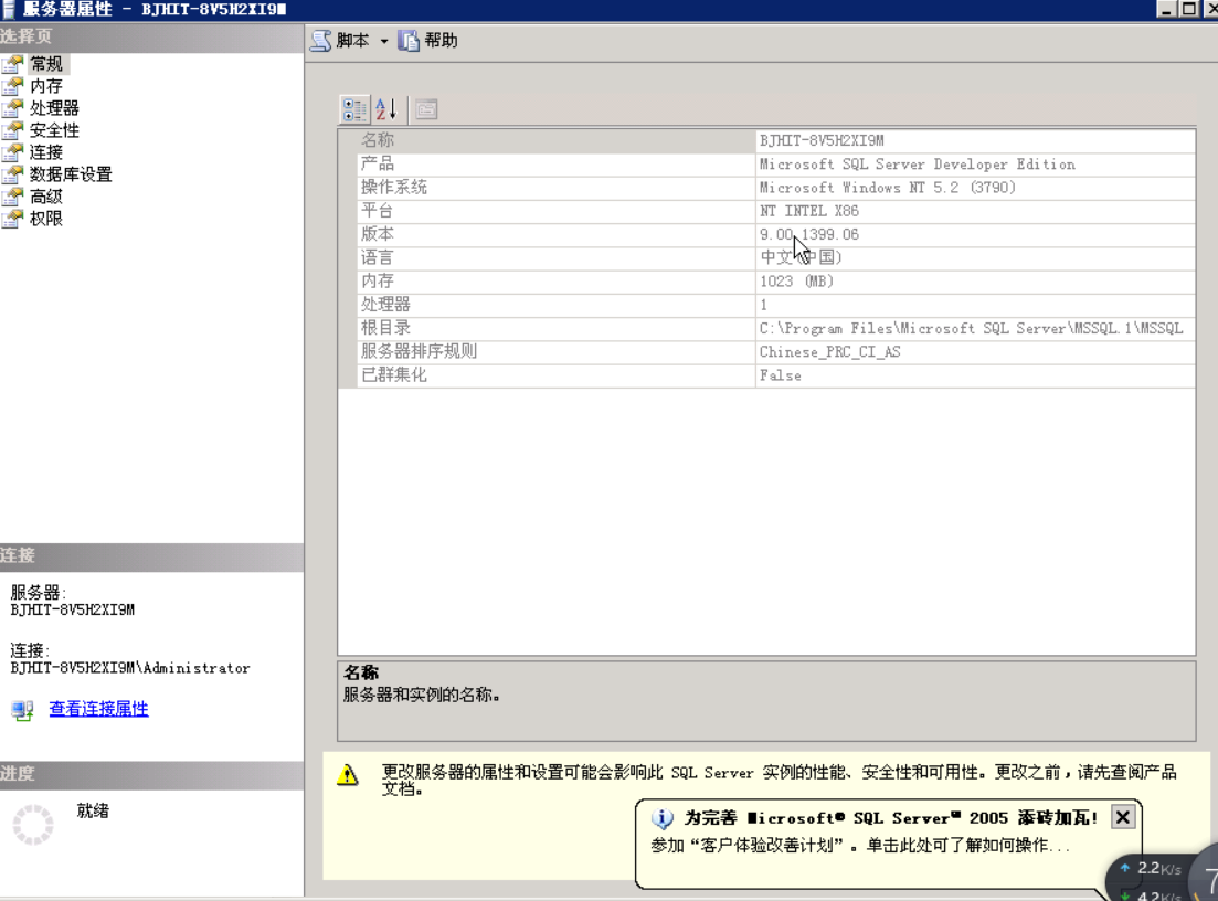 ④在“对象资源管理器”中,右击服务器,然后单击“属性”。