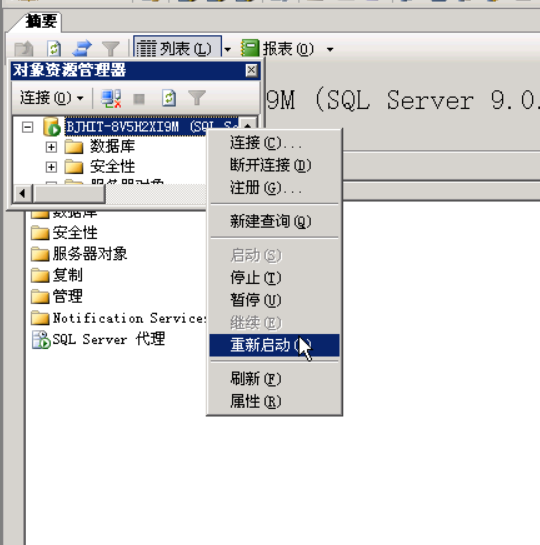 ⑧在“对象资源管理器”中,右击服务器,然后单击“重新启动”。