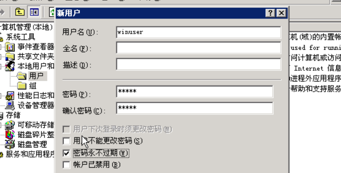 添加一个用户WinUser,并给该用户设置一个密码,本实验使用的密码是admin,密码可随意设置,但是需要记住,在后面需要用到,把用户下次登录时须更改密码前面的勾选去掉,把密码永不过期的选项选上,然后点击创建,设置如图: