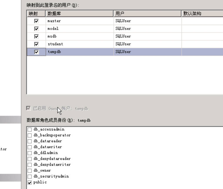 ④选择“用户映射”选项卡,在列表框中列出了该账号可以访问的数据库,如果单击数据库左边的复选框,表示该用户可以访问相应的数据库。在这里,选中数据库master和student左边的复选框,表示登陆用户winuser可以访问的数据库为master和student。在下方的数据库角色成员身份都选择public。然后点击确定。