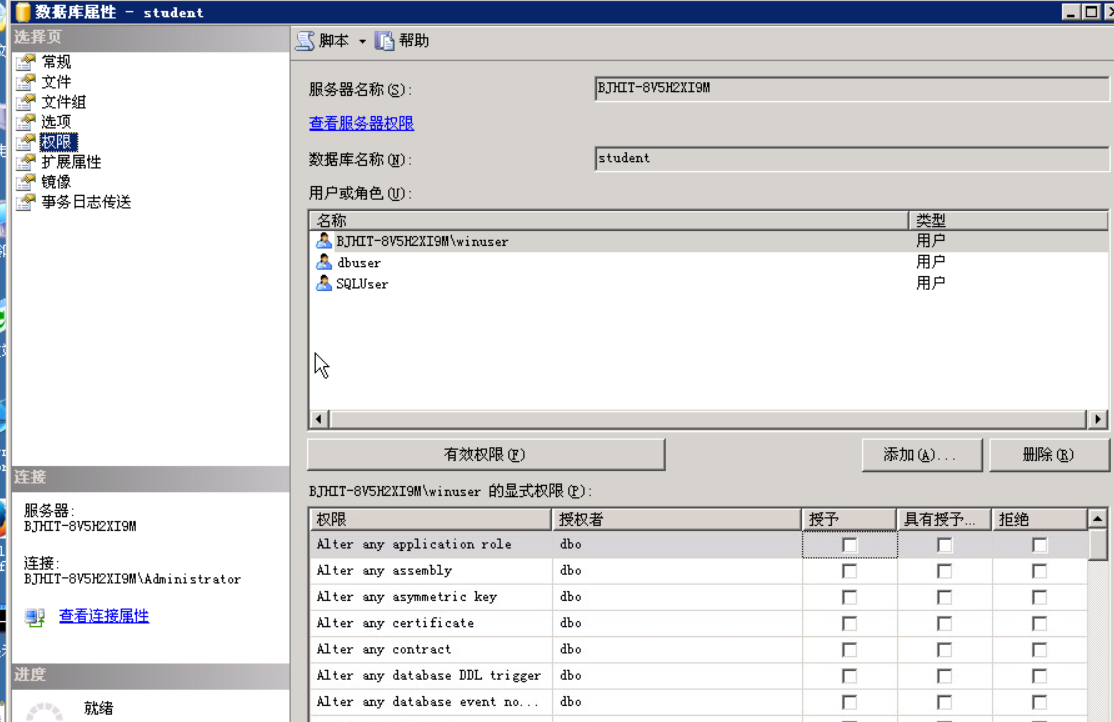 启动SQL Server Management Studio,展开实例数据库,右击student数据库,在弹出的快捷菜单中选择“属性”,然后选择“权限”选项卡。在用户WinUser一栏中,将“创建表”和“创建视图”选中。