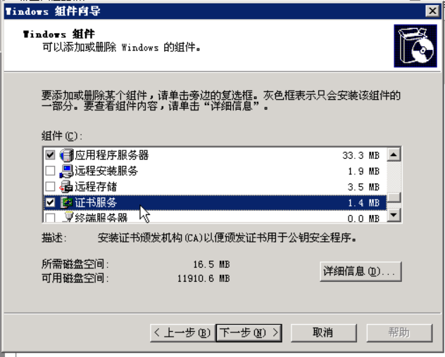 依次点击:“添加删除windows组件”,在组件向导中选中“应用程序服务器”与“证书服务”,先不要点击下一步: