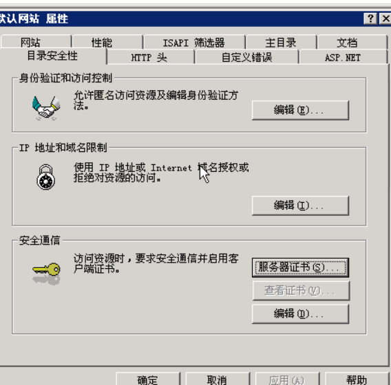 在“默认网站属性”中选择“目录安全性”标签,点击“服务器证书”: