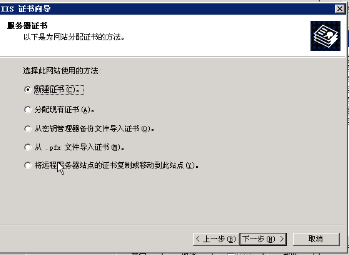 出现如下对话框,保持默认选项“新建证书”不动,继续下一步: