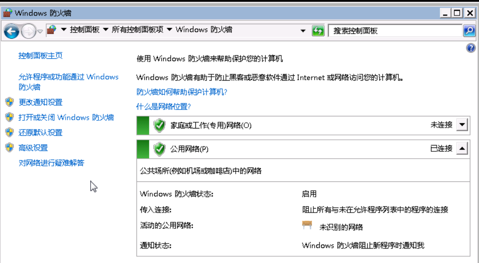 通过点击:开始-->控制面板-->系统和安全-->Windows 防火墙,出现“Windows防火墙”页面: