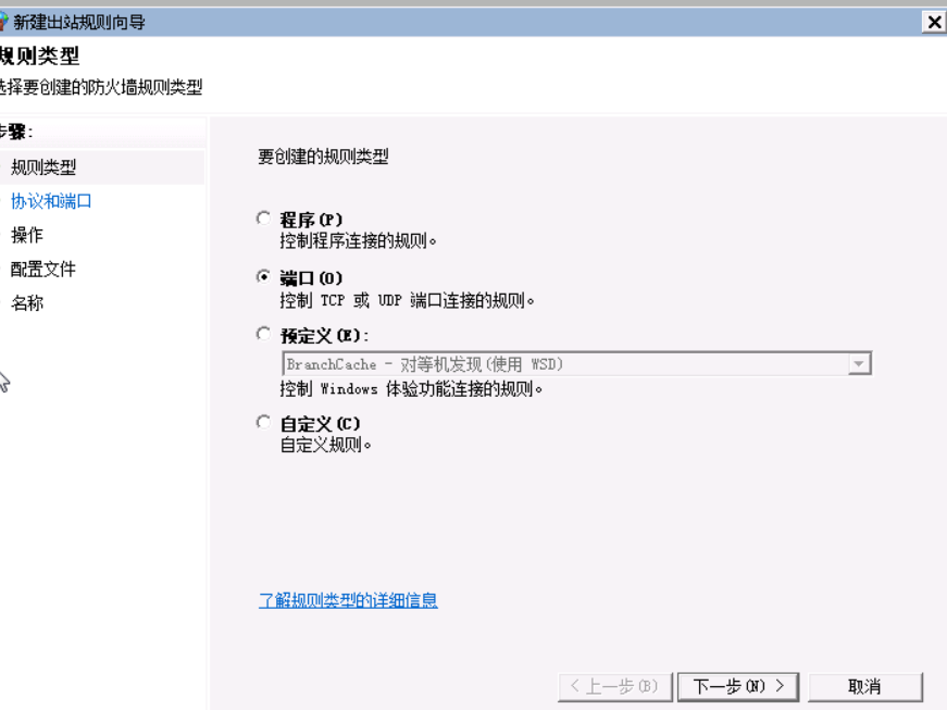 2)首先是“规则类型”配置,选择“端口”,并点击“下一步”。如下图:
