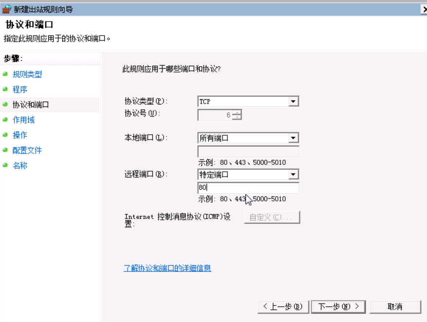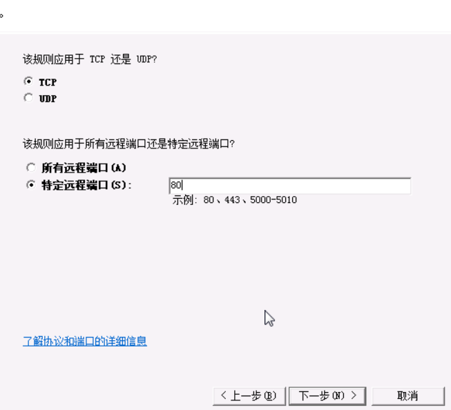 3)在“协议和端口”配置界面,选择“TCP”,选择“特定远程端口”,输入“80”,点“下一步”。见下图: