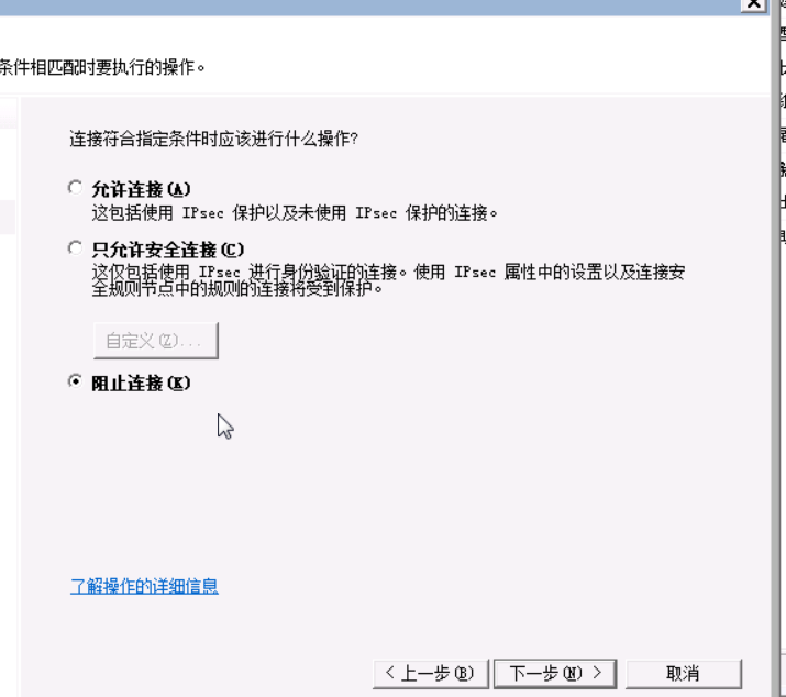 4)在“操作”界面,选择“阻止连接”,点“下一步”。