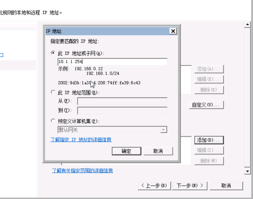 4)在“作用域”界面,点击“添加”,将弹出“IP地址”对话框,输入网址的IP地址,获取IP的方法为CMD 里ping tools.hetianlab.com,点击“确定”,回到“作用域”后,点击“下一步”。见下图: