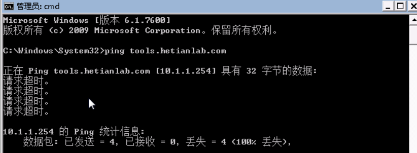 打开浏览器,此时已经无法访问http://tools.hetianlab.com。但可ping通。截图中返回了IP地址说明是通的,请求超时只是网站为了安全而设置的禁ping策略。