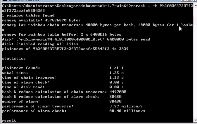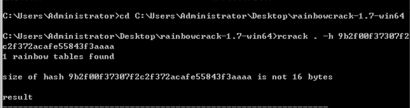 对于单个的哈希值,我们可以直接用rcrack.exe . -h hashnum来进行破解: