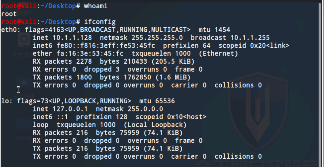 3.查看攻击者主机登陆用户及网络配置信息,从下图3可以看出攻击主机登陆用户为root ,IP为10.1.1.128