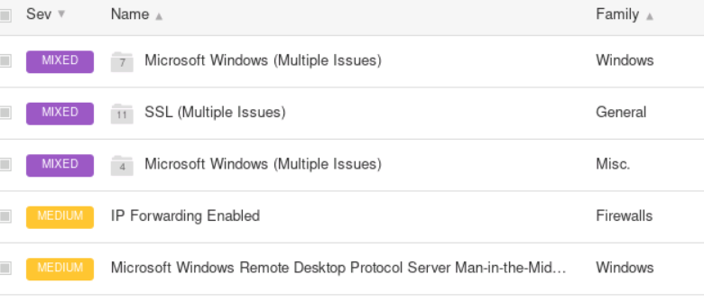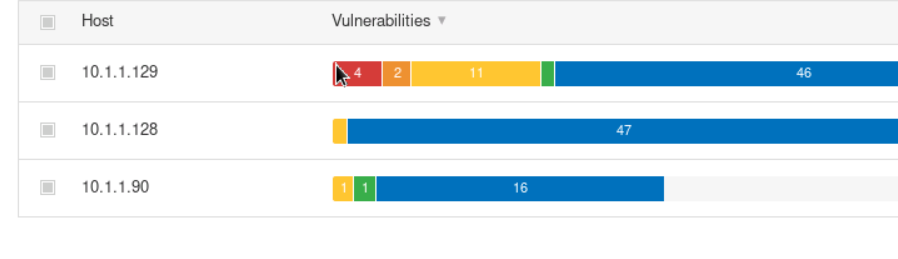 扫描结束后,Nessus会很直观的显示出目标网段的安全情况。下图显示了整个网段的安全信息。Nessus将安全问题归类为Info/Low/Medium/High/Critical五个等级,其中Critical等级的问题是最危险的,Info级别的问题通常是无关痛痒的信息显示问题。