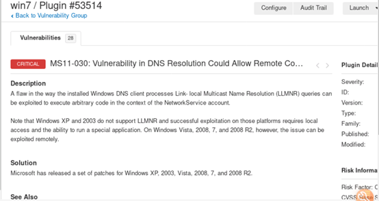 选中高危漏洞,Nessus给出了该漏洞的介绍、风险信息、解决方案等详细信息。Risk information对于攻击者来说非常有用,可以根据Risk information去Google搜索是否存在已知的漏洞利用Exp。