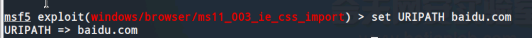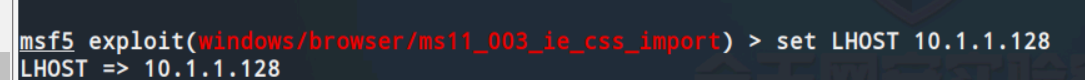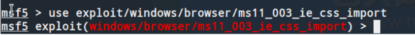 2.运行命令:“use exploit/windows/browser/ms11_003_ie_css_import”选择漏洞利用EXP