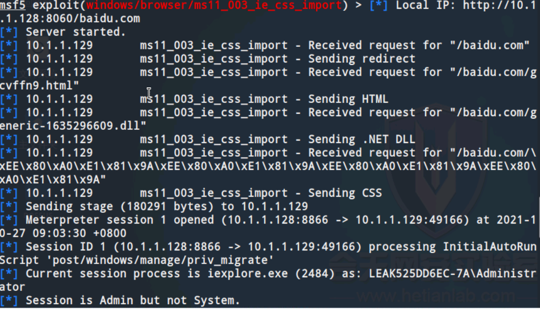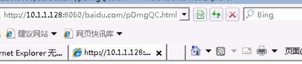 11.在 Win7靶机打开IE,访问http://10.1.1.128:8060/baidu.com,模拟受害者误点击网页,靶机IE如下图所示,攻击者Metasploit显示如下图所示信息表明攻击成功。